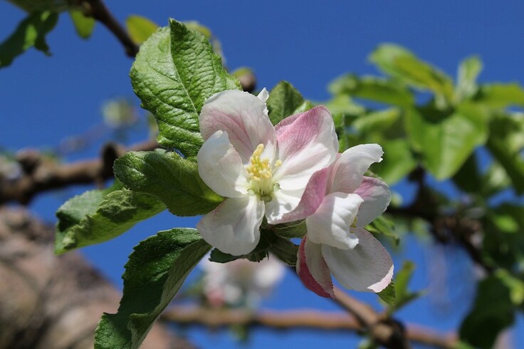 ♪春 りんご並木に 命芽吹くとき 我らの心一緒に 白い花が咲く