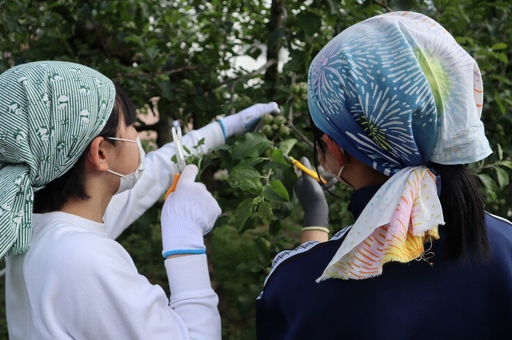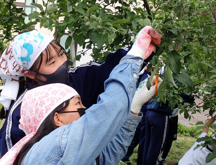 〇5月 小学生と一緒に摘果作業を行います。摘果とは、いくつかあるりんごの実から、中心果以外の実を落とす作業です。小学生に摘果のやり方を教えながら作業をします。