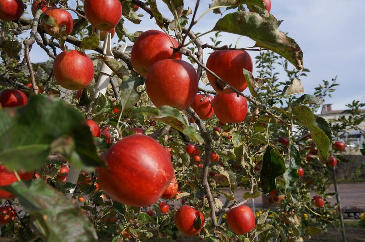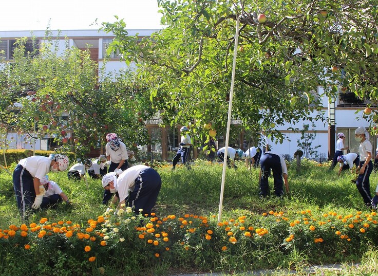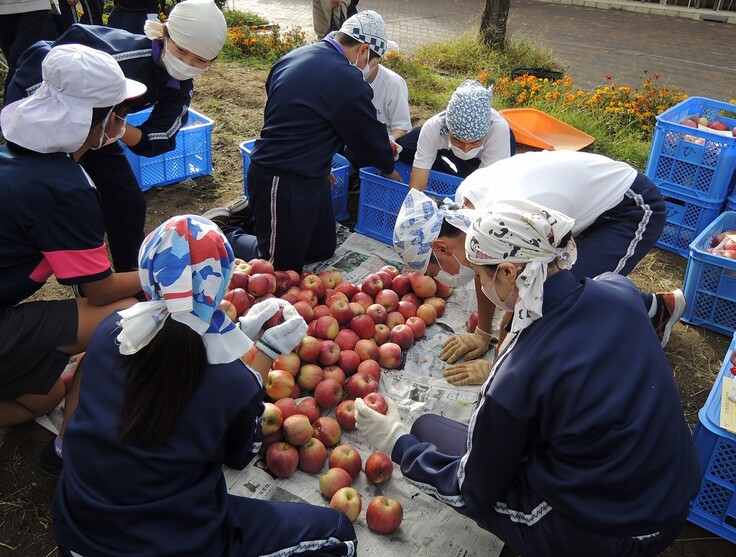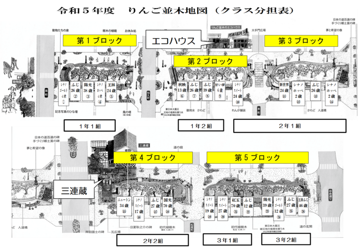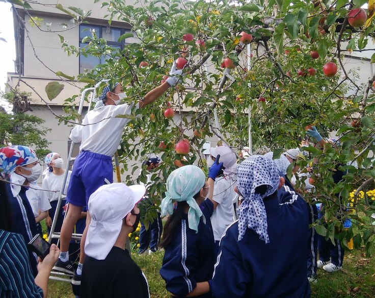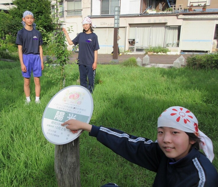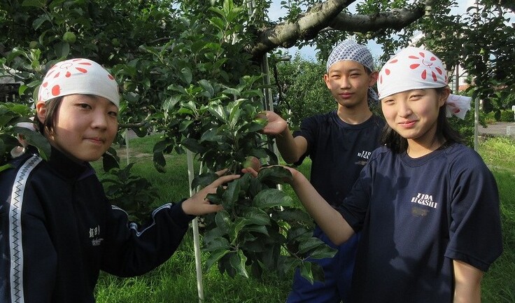 令和5年度、長野県飯田市のシンボルである「りんご並木」が70周年を迎えます。私たち飯田市立飯田東中学校生徒は、先輩方から脈々と受け継がれてきたりんご並木の維持管理にかかわってきています。現在、りんご並木には12品種26本のりんごの木が植えられています。その中の2本は昭和28年に植えられた初代木です。今年70年目の実をつけています。りんご並木に26本あるりんごの木を、1クラス4~5本、クラスの木として大切に生長を見守り、秋には実ったりんごを収穫しています。