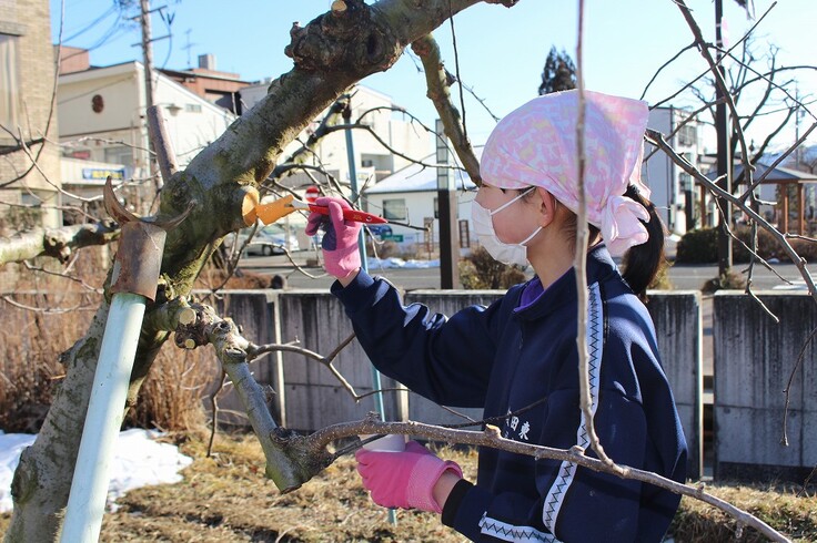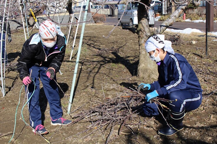 〇1月、りんご並木では枝の剪定が行われます。その枝を片づけたり、切られたところにペーストという薬を塗ったりする作業を行います。