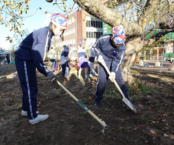 〇11月下旬には施肥作業があります。りんご並木に肥料をまいて、土とよく混ぜます。また、夏花壇を飾ったマリーゴールドの花の片づけもこのときに行います。