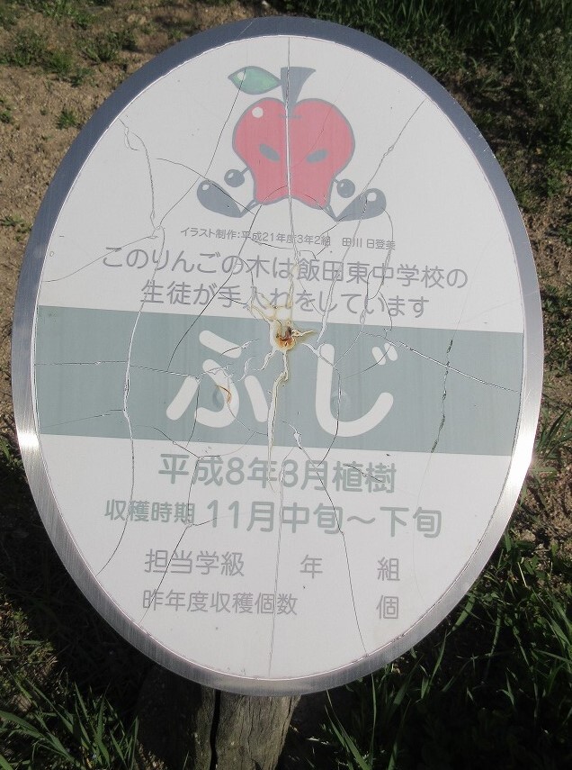 りんご並木にある26本の木には、それぞれの木を紹介するプレートがあります。ここには、木の品種名、植樹した年、収穫時期、担当クラス名、昨年度の収穫個数などが記入できるようになっています。そして、そのプレートを作成した時に在籍していた生徒がデザインした絵が描かれています。このプレートは平成21年に作成され生徒の手で設置されました。しかしながら、この14年間で、プレート自体にヒビが入ったり、穴が空いてしまったりして劣化してきています。さらに、支柱が木でできているため根本が腐り始めたり、土台からはずれてプレートが倒れてしまったりしたところもありました。