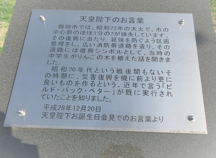 〇平成28年、天皇皇后両陛下がりんご並木を行幸され、記念碑が建立されました。その碑には、後の記者会見でのお言葉が刻まれています。