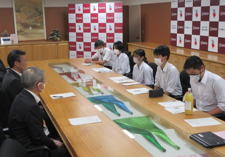 6月28日(木)に佐藤健飯田市長さんを表敬訪問し、飯田東中学校でりんご並木のプレートを新しくするためにクラウドファンディングで資金調達を行うことを報告しました。そこで、りんご並木70周年記念手ぬぐい、りんごジュース、記念品のりんごのストラップとしおり、夢と希望の冊子をお渡ししました。佐藤市長さんからは「りんご並木70周年を迎え、中学生がクラウドファンディングに挑戦しプレートを新しくしようと取り組むことをうれしく思っている。りんご並木は東中の先輩方がつくって守り続けてきた。飯田市のまちづくりのシンボルと言ってよい。市民へのPRも含め、多くの方にりんご並木を知ってもらうために協力していきたい」とご挨拶いただきました。