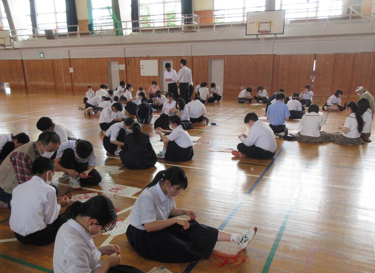 関島水引店さんのご指導のもと、全校で記念品づくりをしています。