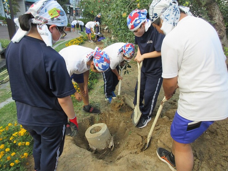 9月1日(金)にりんご並木で作業を行いました。この日は、りんご並木の除草作業をメインに、70周年の記念りんご作りのためのシール貼り、プレートの土台撤去のための穴掘り、並木のまわりにある水路の掃除など、もりだくさんの作業でした。最高気温が35度に迫る勢いの暑い中での作業でしたが、全校で70年目の並木をきれいにしようとしっかりと取り組みました。