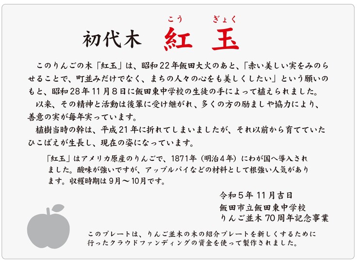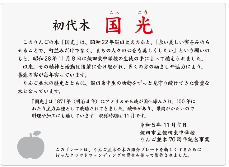 先日、活動報告をし、リターンの郵送を終えましたが、皆様からいただいた支援金で、70年前に植えられた初代木の「国光」と「紅玉」の紹介プレートづくりをしています。