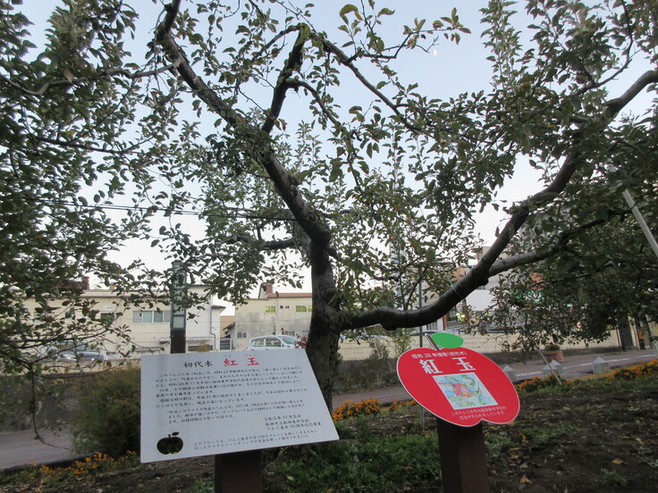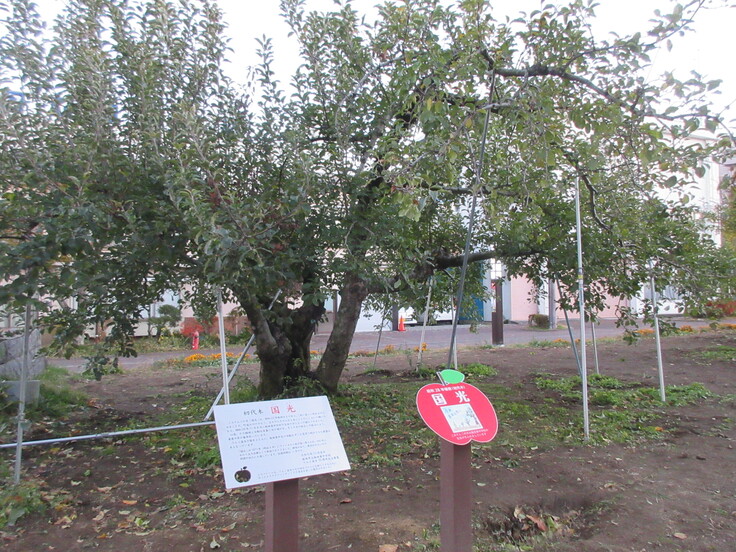 初代木「紅玉」と「国光」の説明プレートを設置しました