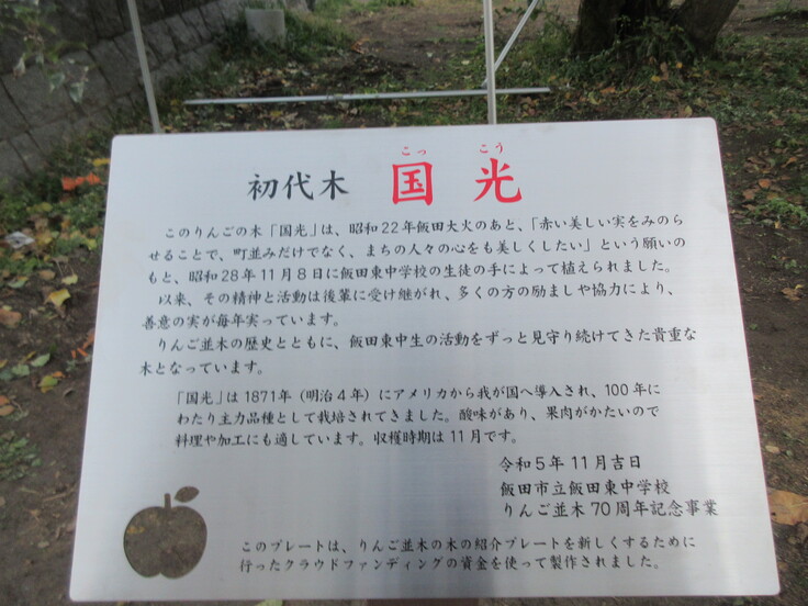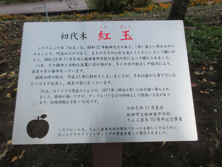 11月20日(月)、収穫作業のあとに、初代木「紅玉」と「国光」の紹介プレートの除幕式がありました。こちらは、クラウドファンディングの余剰金を使って設置しました。除幕式の中で並木委員長は、「植樹当時の木は2本だけとなってしまいましたが、この木が80年、90年100年と生きられるように、まずは東中生が作業をがんばっていくことが大事だ」とあいさつしました。