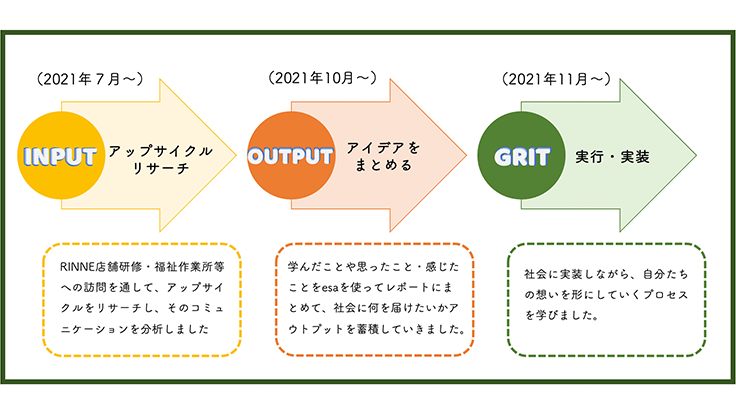 そんなときに不用品を新たな価値にする、ソーシャル・スタートアップ(社会課題領域に対して果敢に挑戦する会社)と出会い、インターンを通して自分たちの価値観が大きく変化し、“決められた正解などない”と出会った人たちからたくさんのことを学びました。