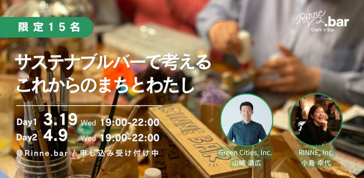 クラウドファンディングでも資金活用のひとつとして、Rinne.barの活動を若い世代につなぐ活動をお約束しています。こと初め「これからのキャリアや生き方」「社会やまちに関わる仕事」について学生さんや、若手社会人のみなさんにお届けするGreen Cities, Inc. 代表・山崎満広さん とRINNE代表 小島のセッションを行います!