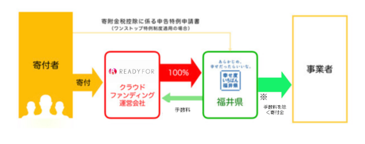寄附金は福井県がふるさと納税として領収し、その寄附金から手数料を除いた額を、奨励金として事業者に支給します。