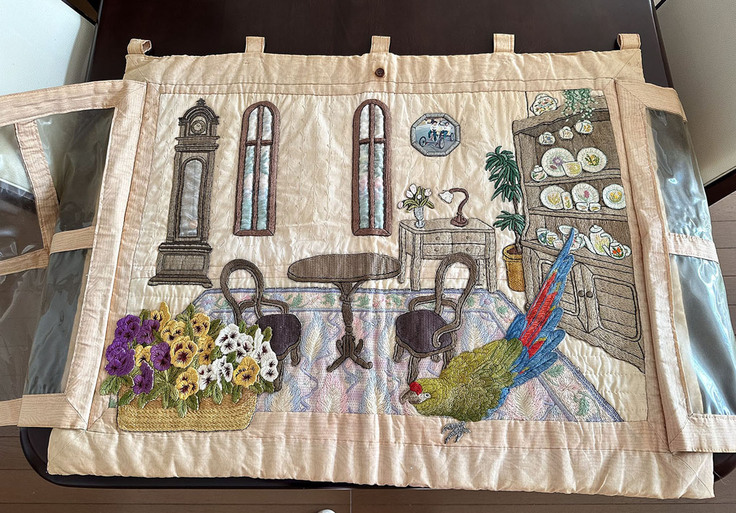 立体刺繡Sayokoの北井小夜子と申します。私は独学で刺繍を学び1991年、毎日新聞社主催の全国刺繍コンクールに初めて応募。「素敵な家の窓を開けたら、どんな部屋が広がっているのだろう?」という想像から生まれた作品は、羽一枚ずつを刺繍したオウムやパンジーの鉢植え、リビングボードやテーブル、イス、じゅうたんに至るまで、すべてを立体刺繍で仕上げたタペストリー『私の夢の部屋』で最優秀賞を受賞しました。
