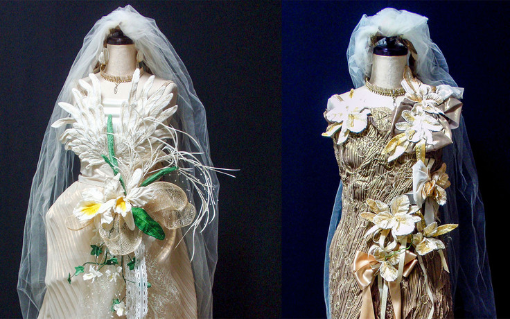 従来の刺繍は、表面はきれいに見えても裏面はどうしても結び目等できれいにはなりにくい平面刺繍でした。表面を刺すだけで裏面も同じになるという独自の両面立体刺繍(1999年商標登録)技法を考案し、1年かけて、完全立体刺繍の3WAYのドレス(羽のウエディングドレス、花のお色直しドレス、パーティードレス)を制作し、1998年ユザワヤ大賞展で金賞を受賞しました。