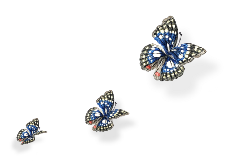 その中、リウマチになり体中が痛くて起き上がることができなかったある日、ふと窓の外にひらひらと飛んでいる蝶を見て、「私もあの蝶のように、自由に舞い上がりたい」と思い、蝶を作るため起き上がりました。蝶の羽は左右対称でなければならず、刺す方向が異なるため、片羽が大きくなってしまいます。その繊細なバランスを追求する中で、何度も失敗を重ね、試行錯誤しながら独自の技術を考案。綿の刺繍糸よりも細い糸やプラチナ糸、本金糸などすべて一本取りで、表面を刺すだけで裏面も同じになるという独自の両面立体刺繍技法で羽を刺し、その上からカラー金糸、ラメ糸を添えるように刺して羽の薄さや蝶特有の輝きを再現。蝶自体がブローチになっているので、羽が開いたり閉じたりと、本物の蝶と同じ動きや形状のできる蝶のブローチを作ることに成功。