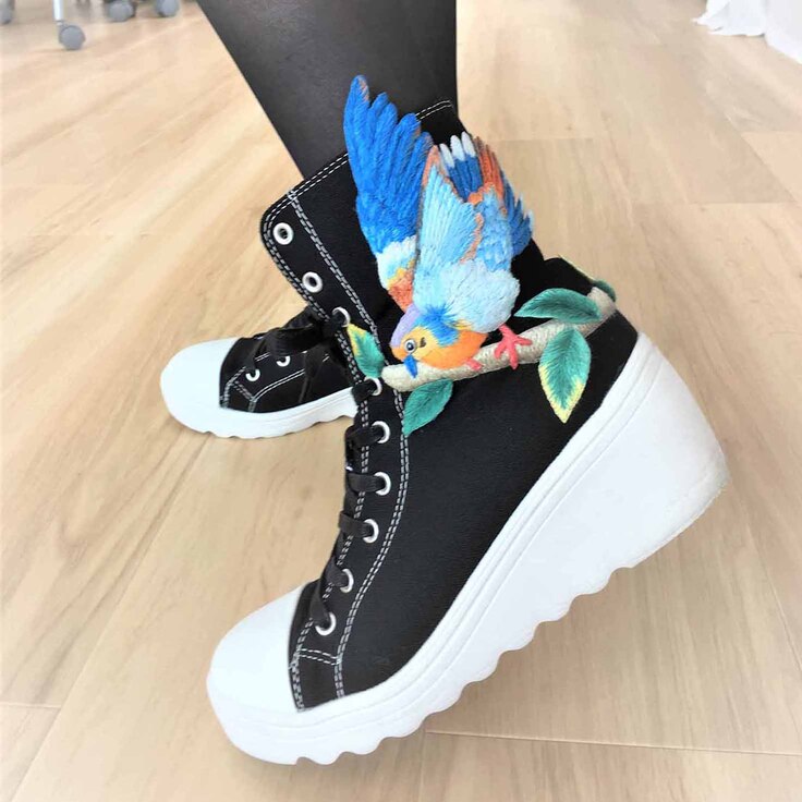 羽一枚ずつを刺して縫い止めたシューズや愛犬のバッグなどを掲載予定