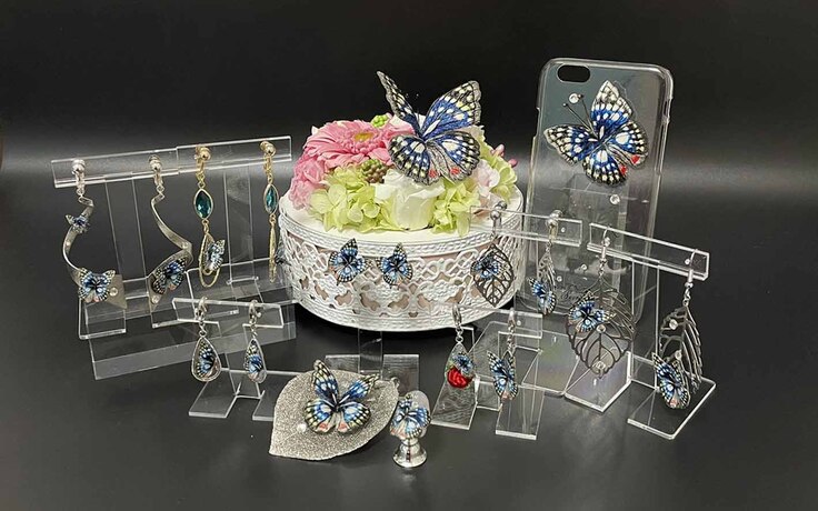 また、ヘレナモルフォ蝶を、羽の開き方を5段階で撮影・デジタル化し、刺繍ならではの繊細な質感と美しさをそのまま表現。そこから立体的なデジタル蝶をつくり、UVレジンでツヤと透明感をプラス。重ね塗りすることで、色や模様も一層鮮やかに仕上げています。立体刺繍のヘレナモルフォ蝶とお揃いのデジタル蝶のイヤリングやネクタイピンをリターンとしてご用意しています。