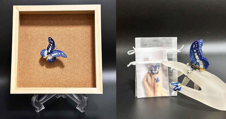普段は、額に飾って蝶の標本のようにアートとして、ジュエリーとしてお使いの際は、羽をたたみ、本物の蝶をそっと手に取るように額から外し、付属のポーチに入れてバッグに忍ばせてお出かけください。