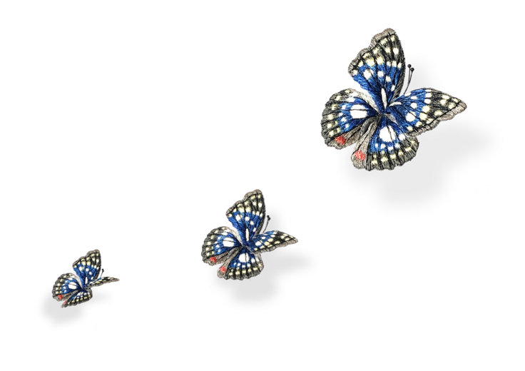 蝶は、綿の刺繍糸よりも細い糸1本を使い、独自の両面立体刺繍で羽を刺しました。