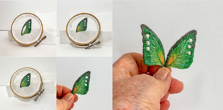 この技法により、本物の蝶と同じような動きや形状を再現できる、立体刺繍の蝶ブローチが誕生します。完成に向けて、ぜひ見守っていただけたら幸いです。次は、下羽の人参色の制作に入っております。
