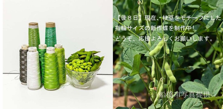 さらに現在、船橋市の特産「枝豆」をモチーフにした指輪サイズの新作蝶、**「枝豆色の蝶」**の制作に取りかかっています。羽が小さい分、限られた面積の中で色の妙を表現するのは難しく、また、両面立体刺繍で仕上げるため、手への負担も大きく、慎重にひと針ずつ進めています。
