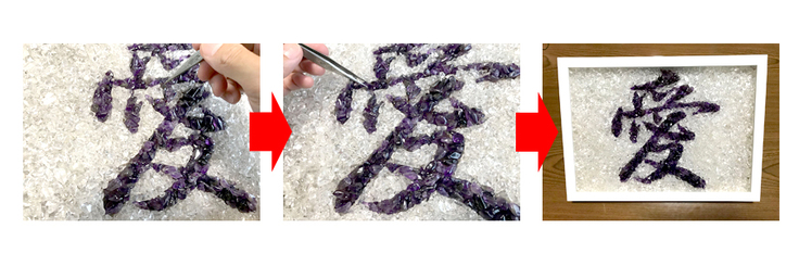 作品作りはこのようにして文字と背景の部分をピンセットを使い綺麗に形づけていきます。この作業は非常に時間がかかりますが日本人としての職人技が無ければ決して作る事は出来ませんし、世界に同じものは一つと存在しません。