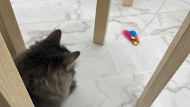 お魚さんで誘き出してもダッシュで捕まえてまた椅子の下へ行ってしまいます。