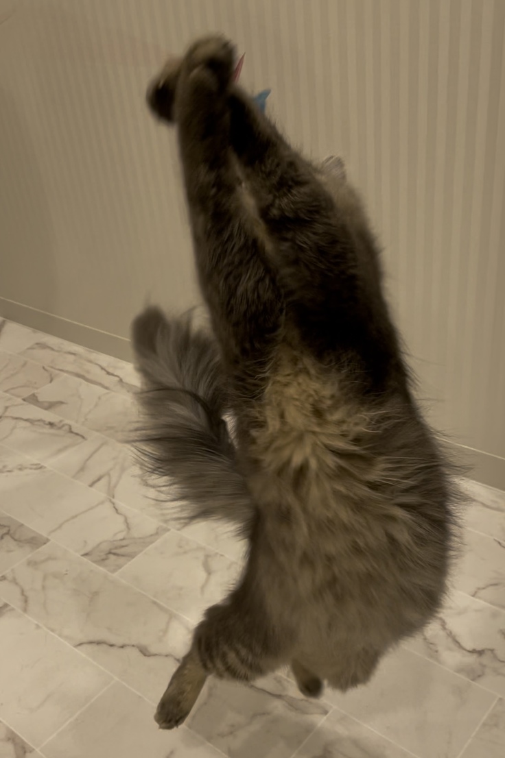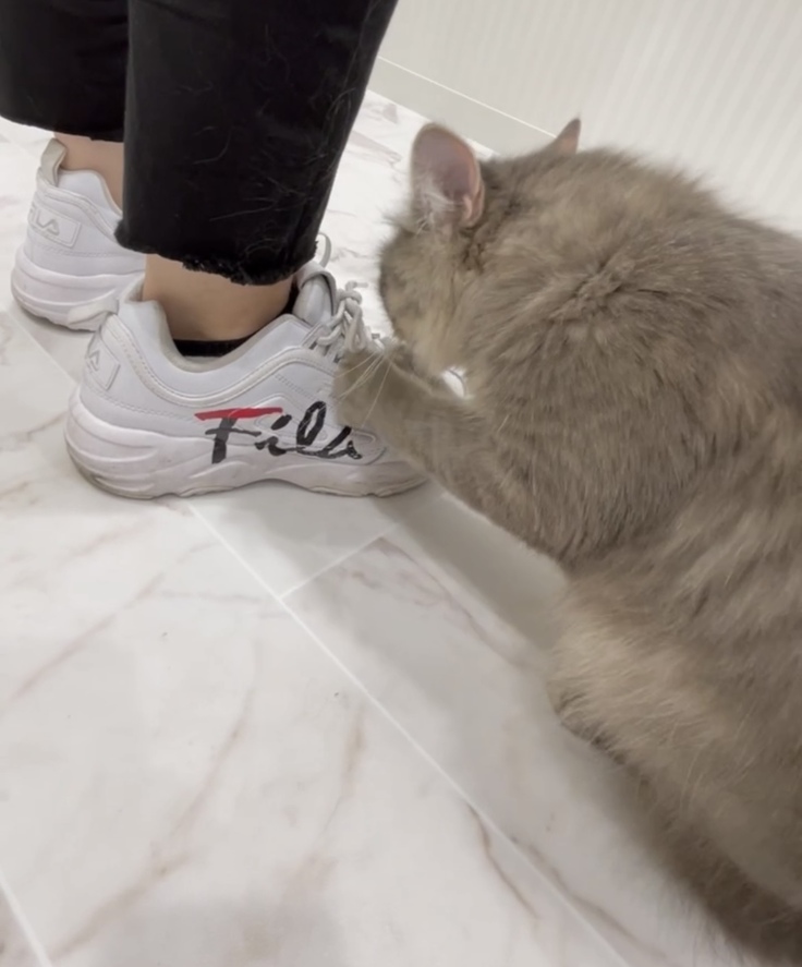 スーパーなポーズでしゃかぶんを追った後は、飼い主(メス)の靴で爪とぎ😂😂