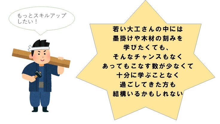 では墨掛け、木材の刻みの学びの時間がとれなかった大工さんに再び学びの場を設けよう。