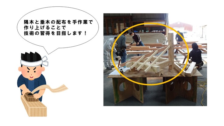 〇隅木と垂木の配布、墨掛けと刻みの大工技術の習得を目指します。