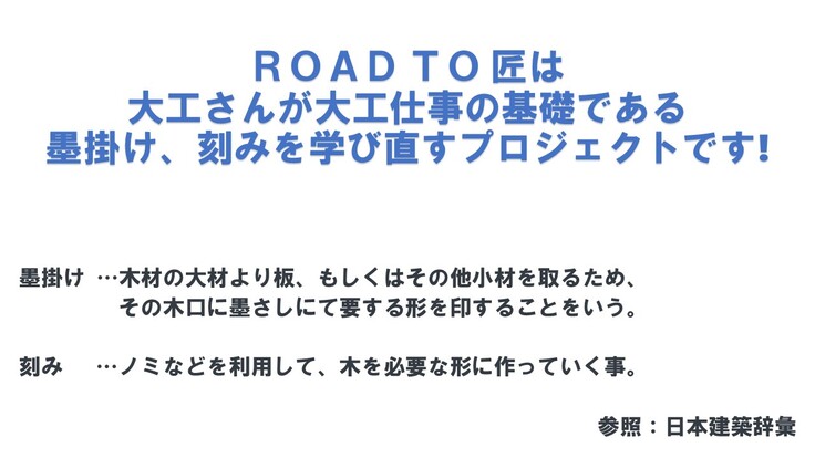 これが、大工さんが大工仕事の基礎を学び直す、もう一度思い出してもらう「ROAⅮ TO 匠」プロジェクトの立ち上げのきっかけです。