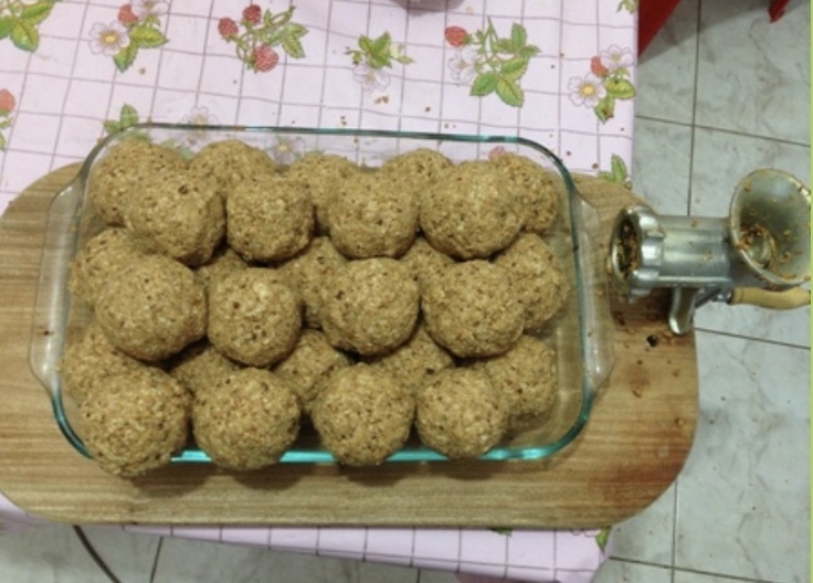 ↑味噌玉と言うそうですが、ボールみたいに丸めて保存容器に投げつけるように入れて空気を抜きます。右に写っているのは肉挽き器ですが、大豆を潰すのに使っています。