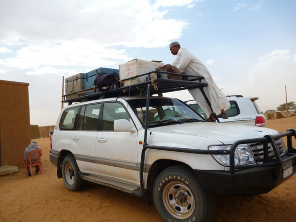 診療に必要な医療機材やワクチンを運ぶボックス、それに8名の荷物などを掲載するために、車の上にキャリーをつけました。