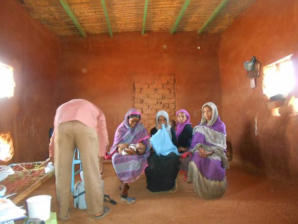 酷暑の環境の中、ロシナンテスの巡回診療チームは、乳幼児への予防接種を行っています。