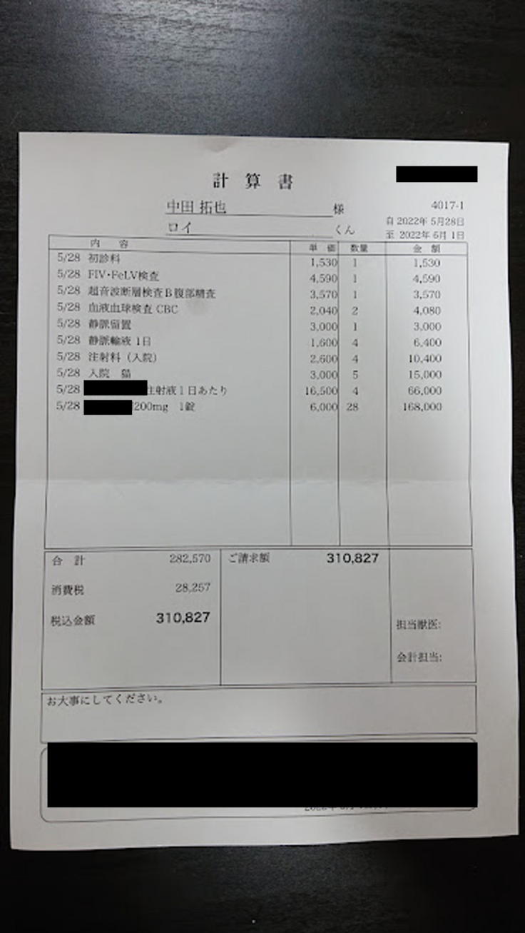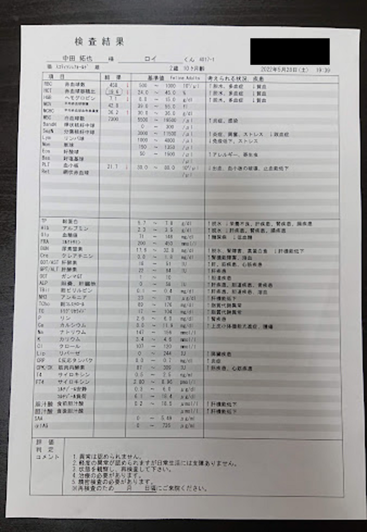 5月初旬、ロイがぐったりしており食欲もなくなんとなく体が熱かったため動物病院へ連れていきました。血液検査の結果、炎症の数値が高く熱もあったため抗生物質の注射と点滴をして様子見ということでその日は終わりました。