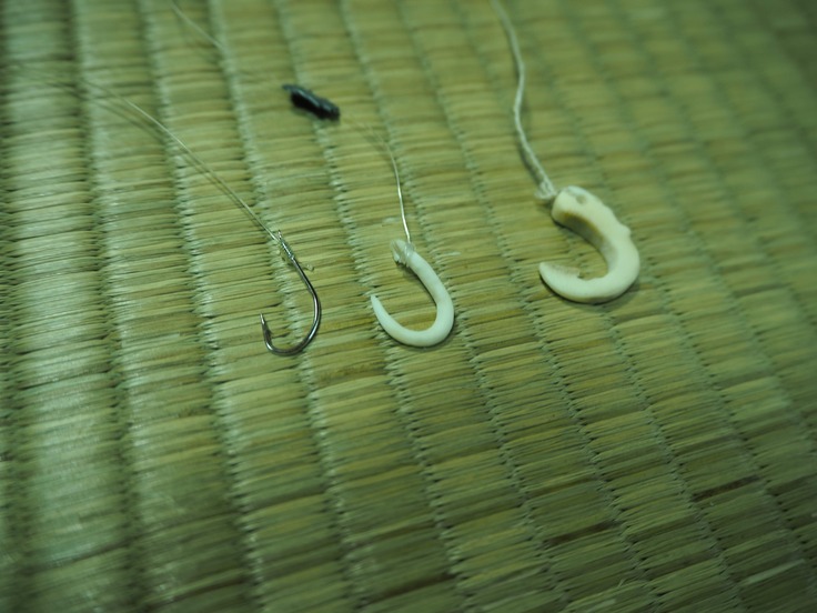 初めは、もちろん鹿の角で釣り針をつくってみるところから始めることにしたのですが、 三上さんも、当時の鹿角製釣り針の写真や現在の釣り針を参考に、試作品を作ってきてくれました。