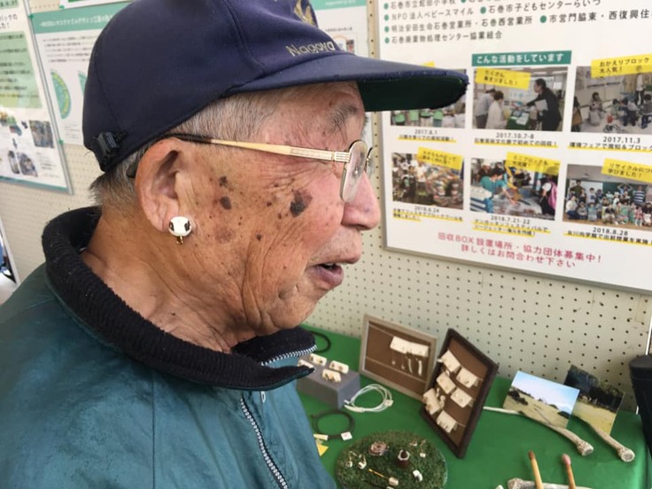 Another activity of Rokkaku Project is participating in Ishinomaki Arts and Culture Festival. Usually, we share a booth with Sustainable Design Kobo Inc. to show some of the deer horn product that we produced. Mr. Mikami has always been there to support us during the event. He sometimes brings his vintage black-and-white photos of Kinkasan Island’s deers and monkeys. He took it all by himself when he was young. Visitors can see his works while listening to his stories of deers and the island. His stories and photographs move people in awe. In rare occasion, Mr. Mikami can be a professional model for deer horn jewelry too.