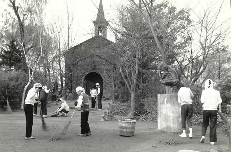建設にあたっては中学生が、煉瓦、玉石、瓦の運搬を手伝っており、当時の映像も残されております。隣の中学校との関係はつづき、鑑賞や写生会に訪れるだけでなく、中学生が掃除の時間に館庭などを掃除にきてくれる伝統が、いまもなお続いています。