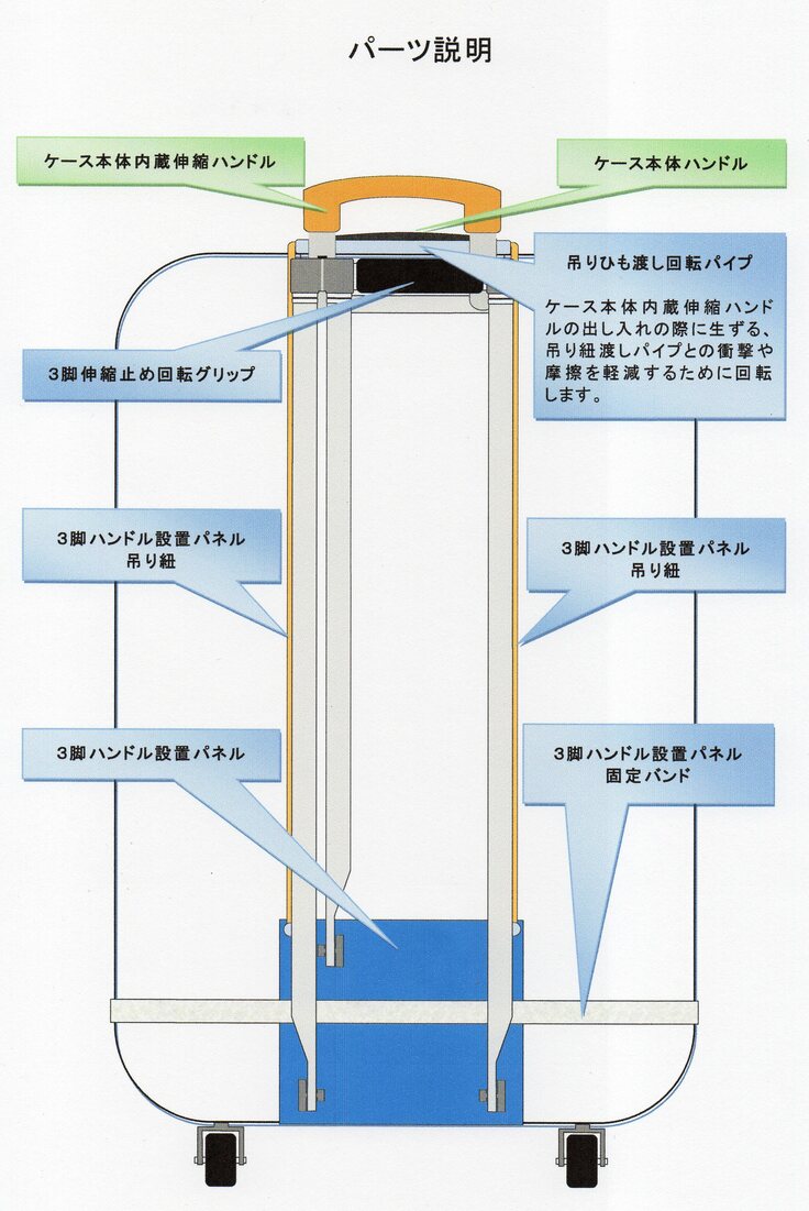 (A) キャリーケース専用3脚ハンドルの正面画像で青色の四角い部分は設置パネルです。