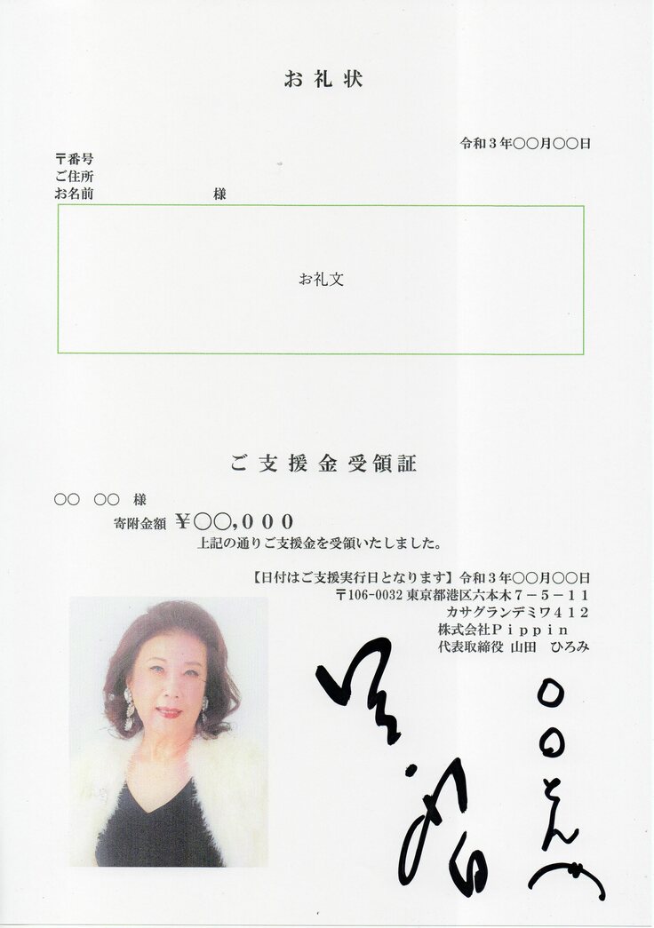 ●ロミ・山田の写真と直筆サインにご支援者様のお名前を記した「お礼状兼ご支援金受領証」をお送り致します。