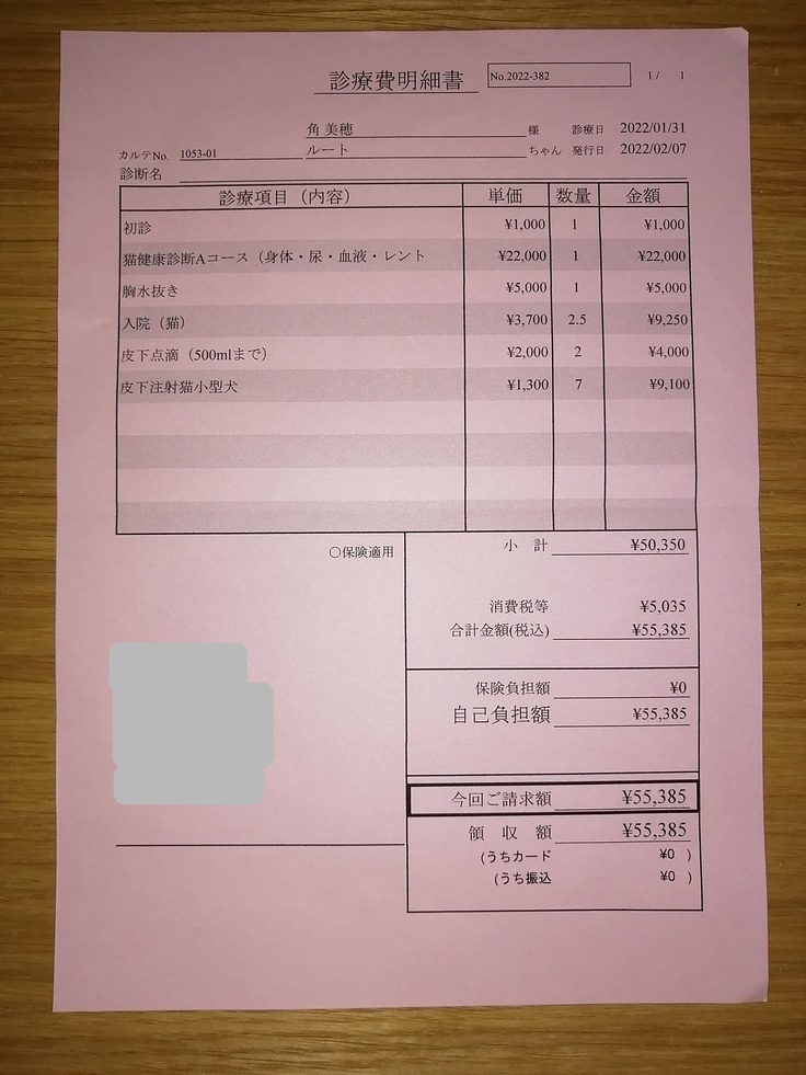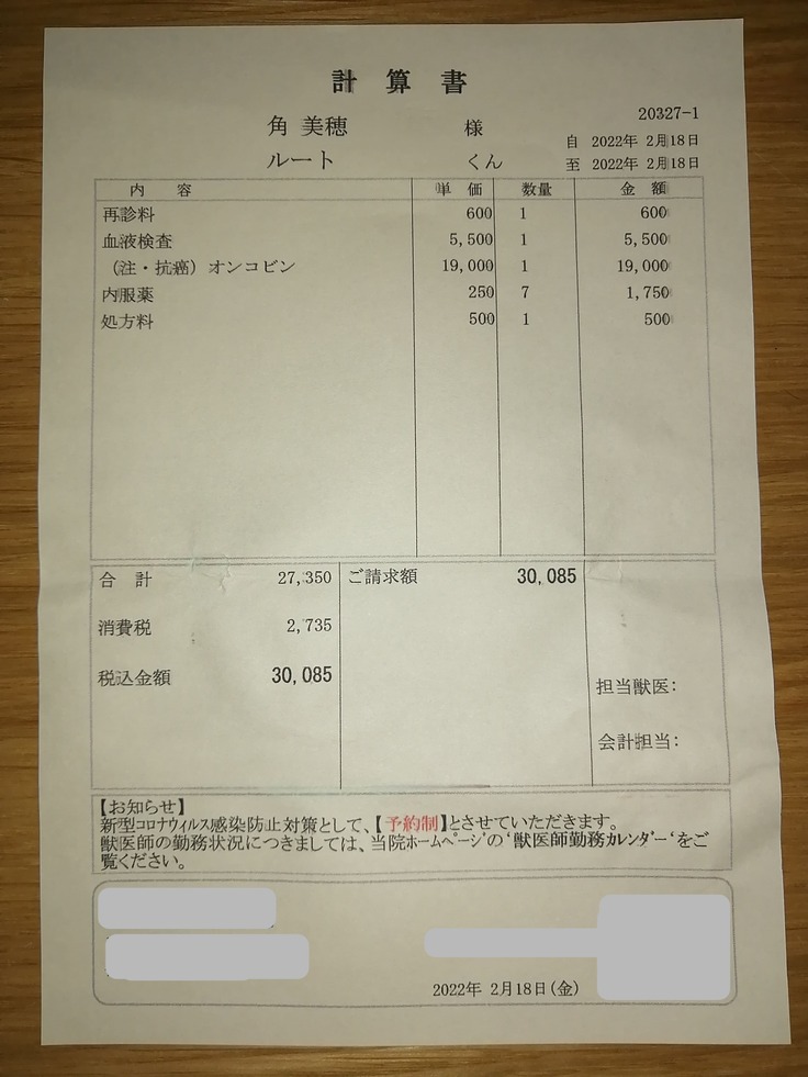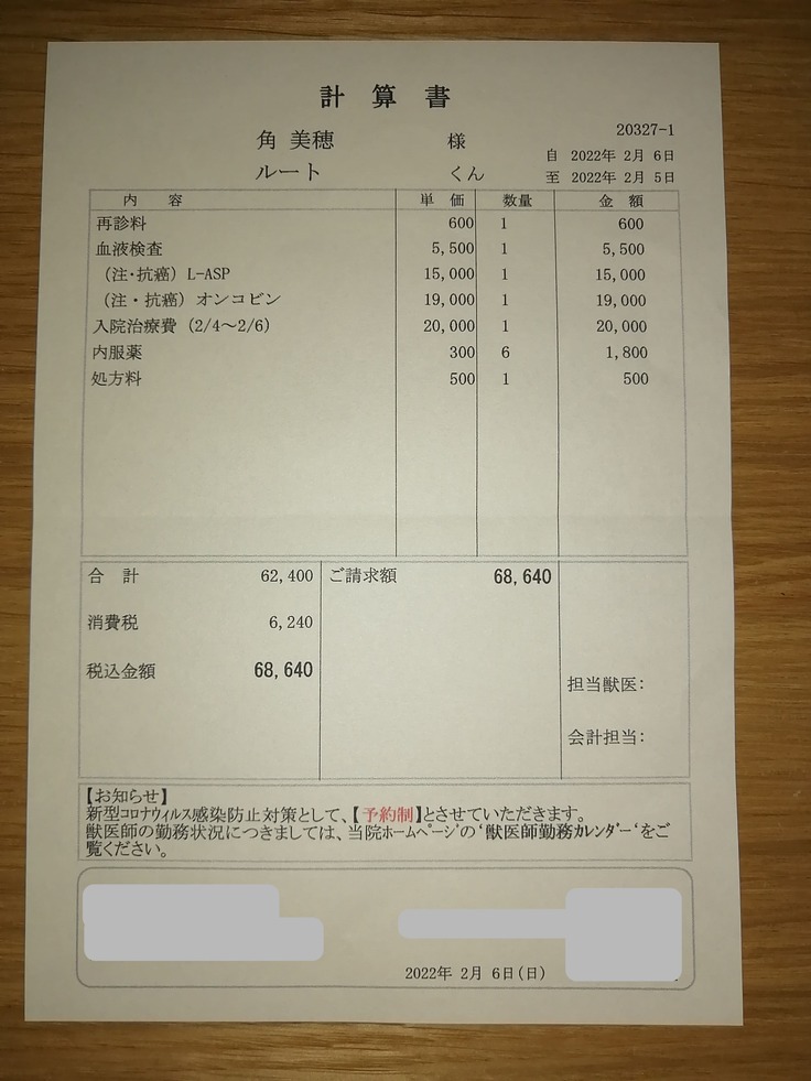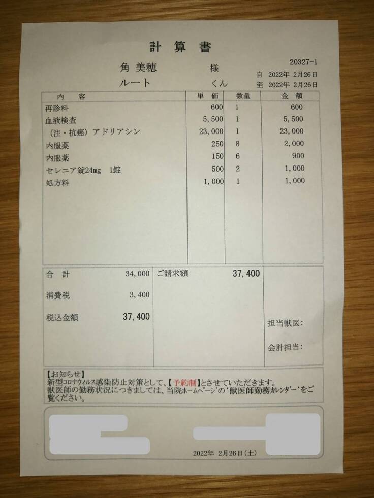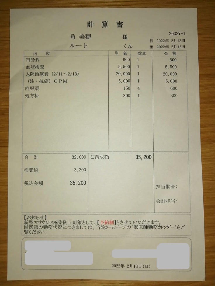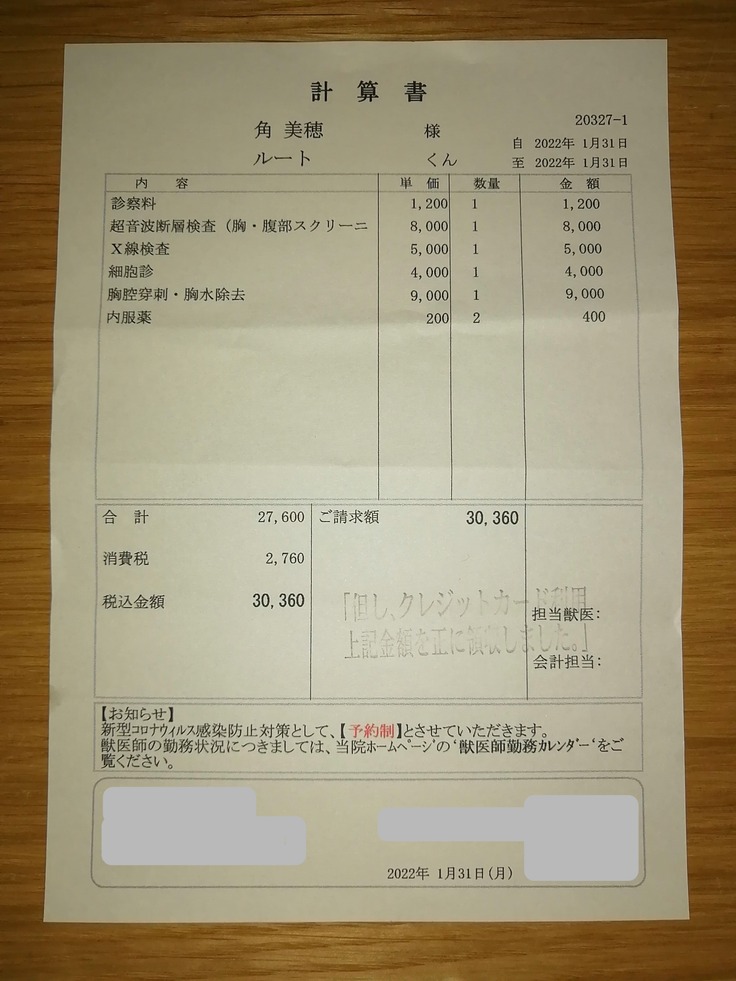 ルートは抗がん剤の副作用も少なく順調に治療が進んではいますが、今後抗がん剤治療後も2ヶ月に1回の血液検査、胸部X線検査、超音波断層検査(胸・腹)でプラスの費用が発生してきます。