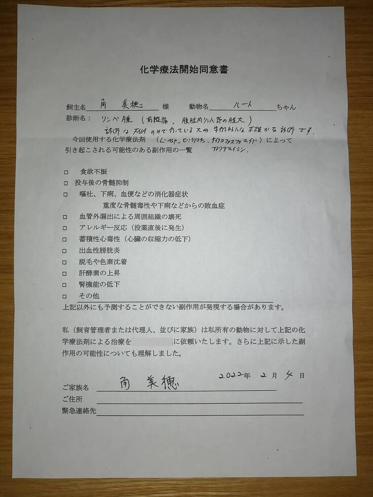 ↓リンパ腫に対する抗がん剤治療の同意書 と 治療の承諾書