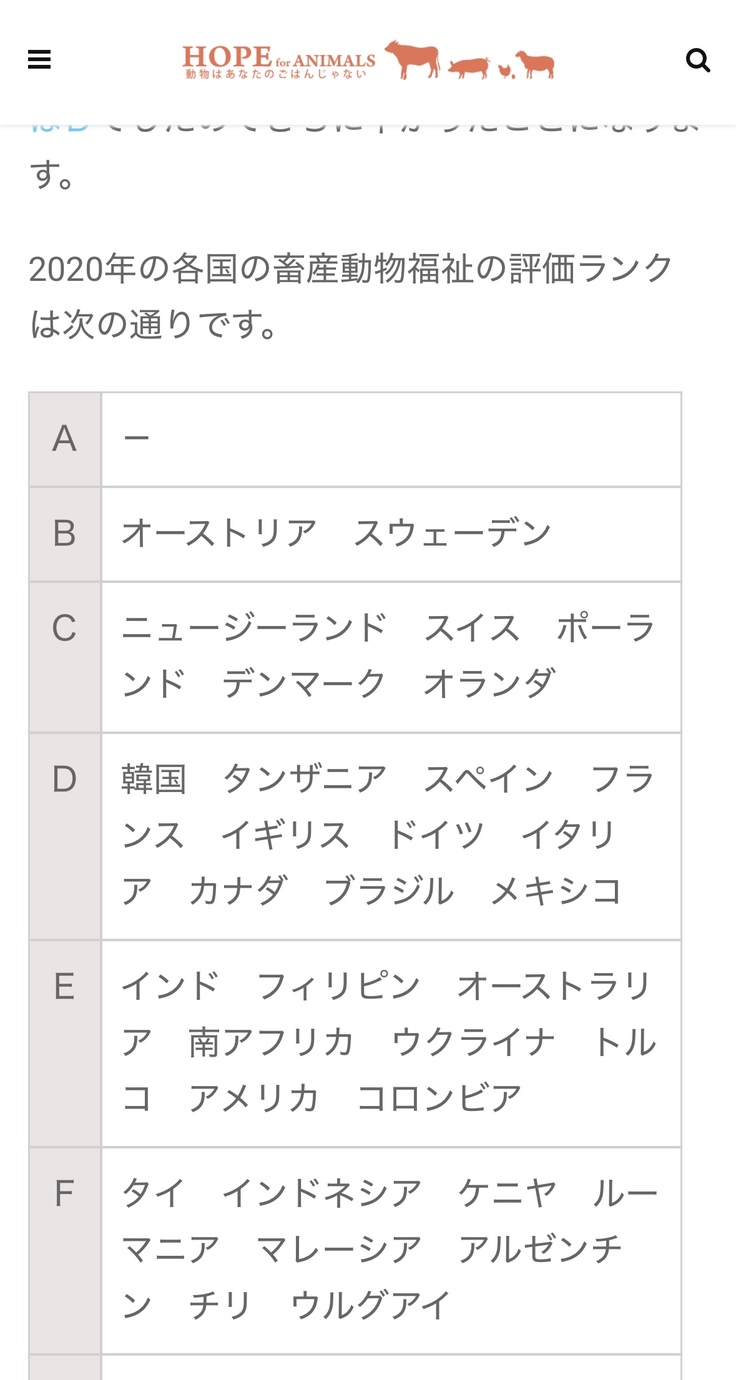 要は、各国が家畜を含めて動物に対して、どれくらい優しくて寛容なのー??