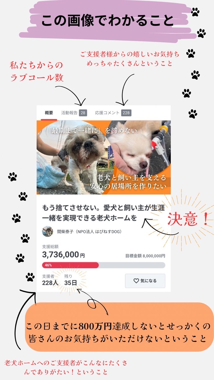 ・老犬ホームありきで、早めに開店できて犬達を受け入れれる(工事のお金が払えなければ工事がストップする可能性があります)
