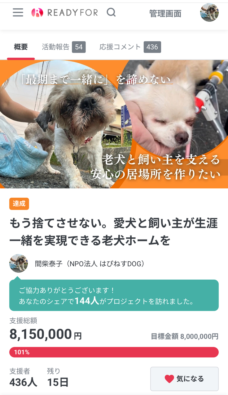 この度、9月14日にクラウドファンディングの第一目標800万円 を達成することができました。