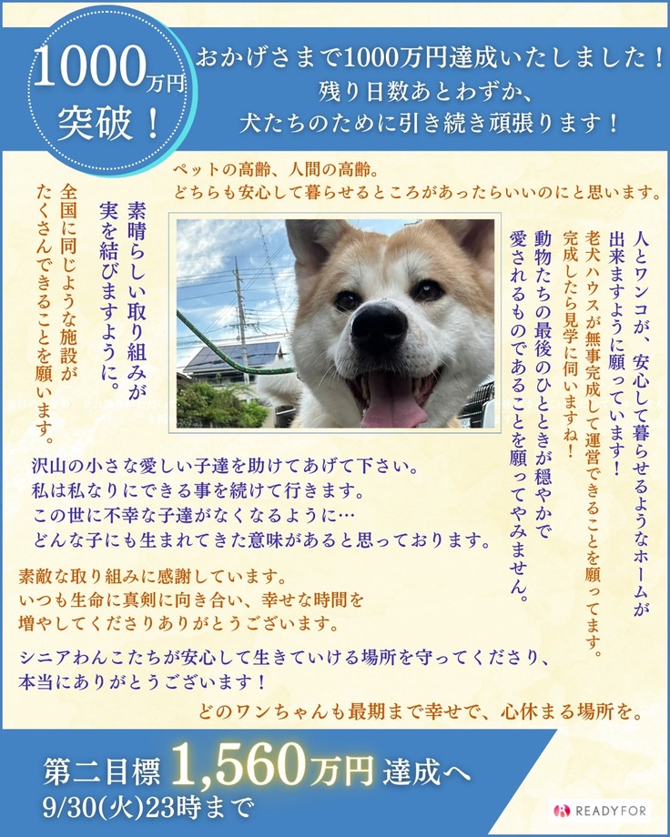 皆さんの愛を集約して、わんこに安心安全に過ごしてもらえる老犬ホームの設立を!
