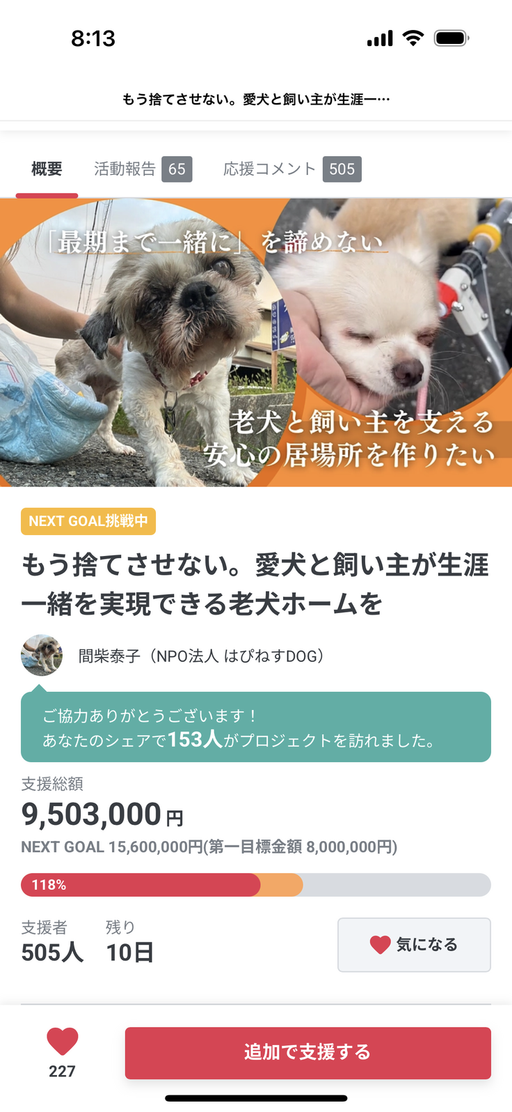 【老犬ホームの設立】に、賛同とご支援を頂けると、これからも心強く活動できます!