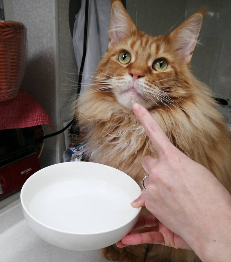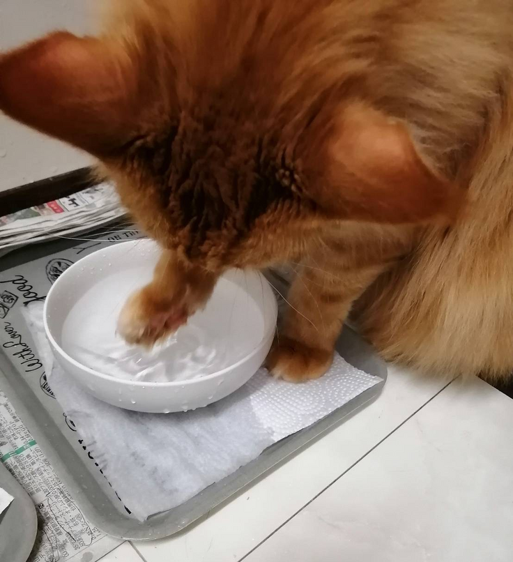 手をお水にビシャビシャつけて、それを舐めて飲むのです。