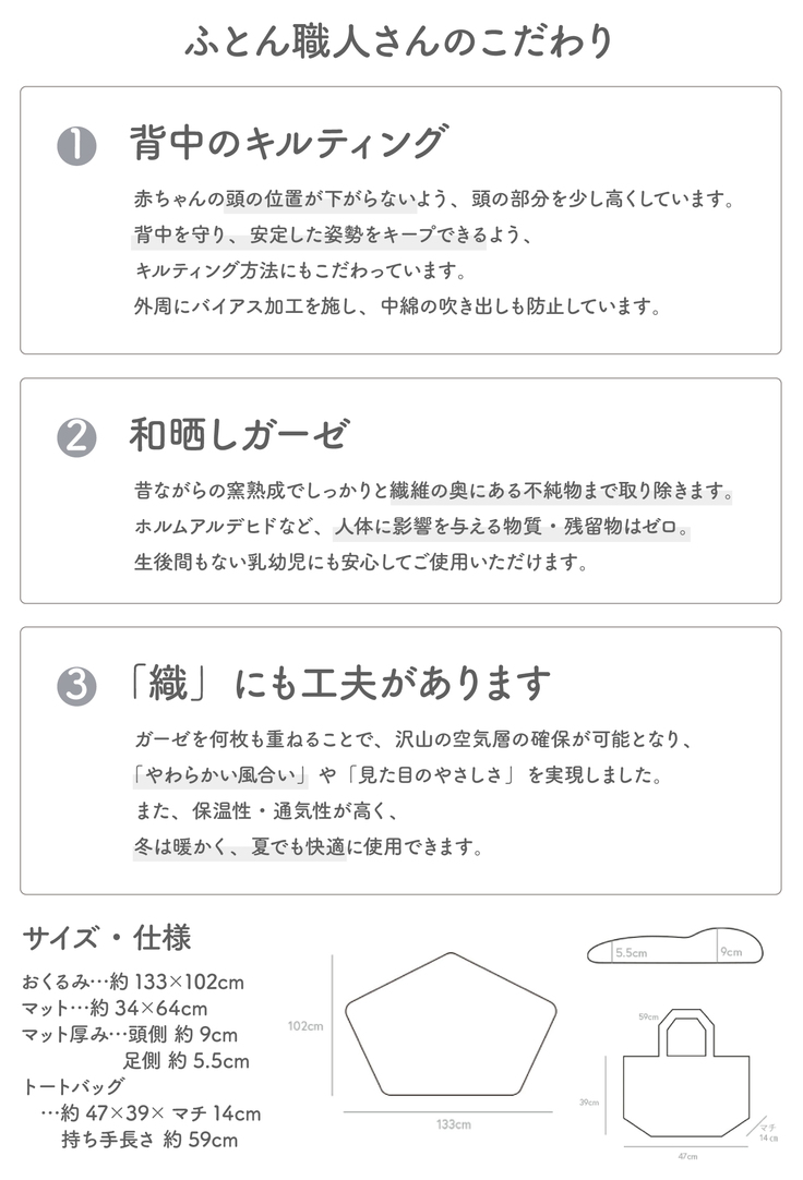 広島県福山市の布団職人さんが心を込めて作って下さっています。素材や製法にもこだわり、安心して使用できるよう仕上げました。