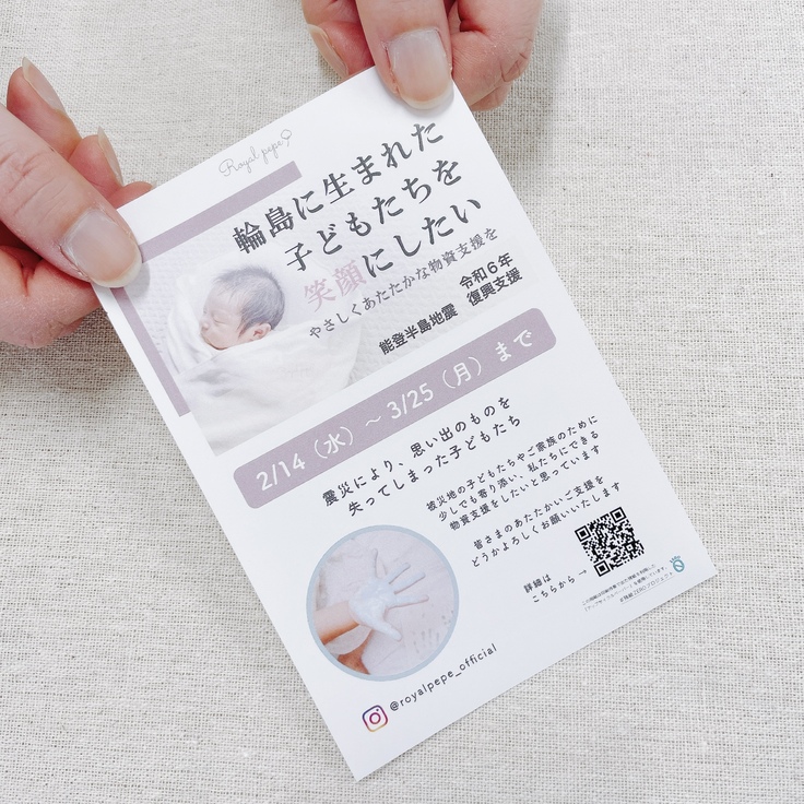 震災により、大切な成長記録や思い出のものを失った子どもたちに、手形足形アートポスターやおえかき帳などを、少しでもあたたかい場所で寝んねしてもらえるよう、赤ちゃんにはおくるみ布団を寄付したいと思っております。